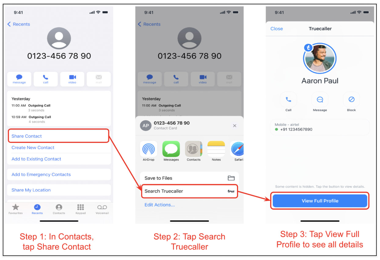A quick way to search for a number on Truecaller is through sharing the Contact and tapping on Search Truecaller