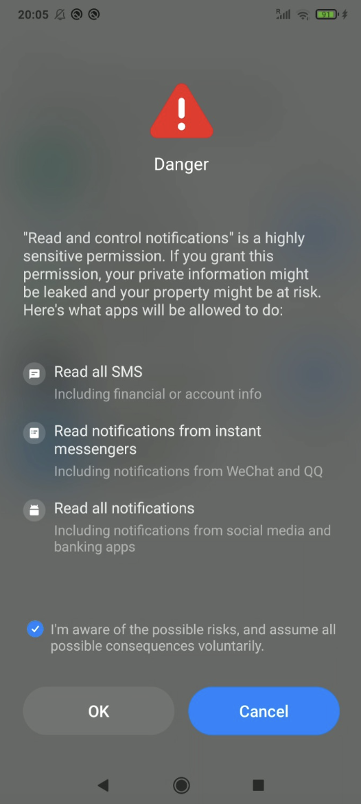 If you're a Xiaomi user and you try to grant notification access permission, you may come across a warning screen that mentions "Danger." However, there's no need to worry. Xiaomi is simply taking steps to protect its users and ensure that users are making informed decisions about which apps they want to grant permission to. It's worth noting that all system permissions use the same screen on a Xiaomi device.
