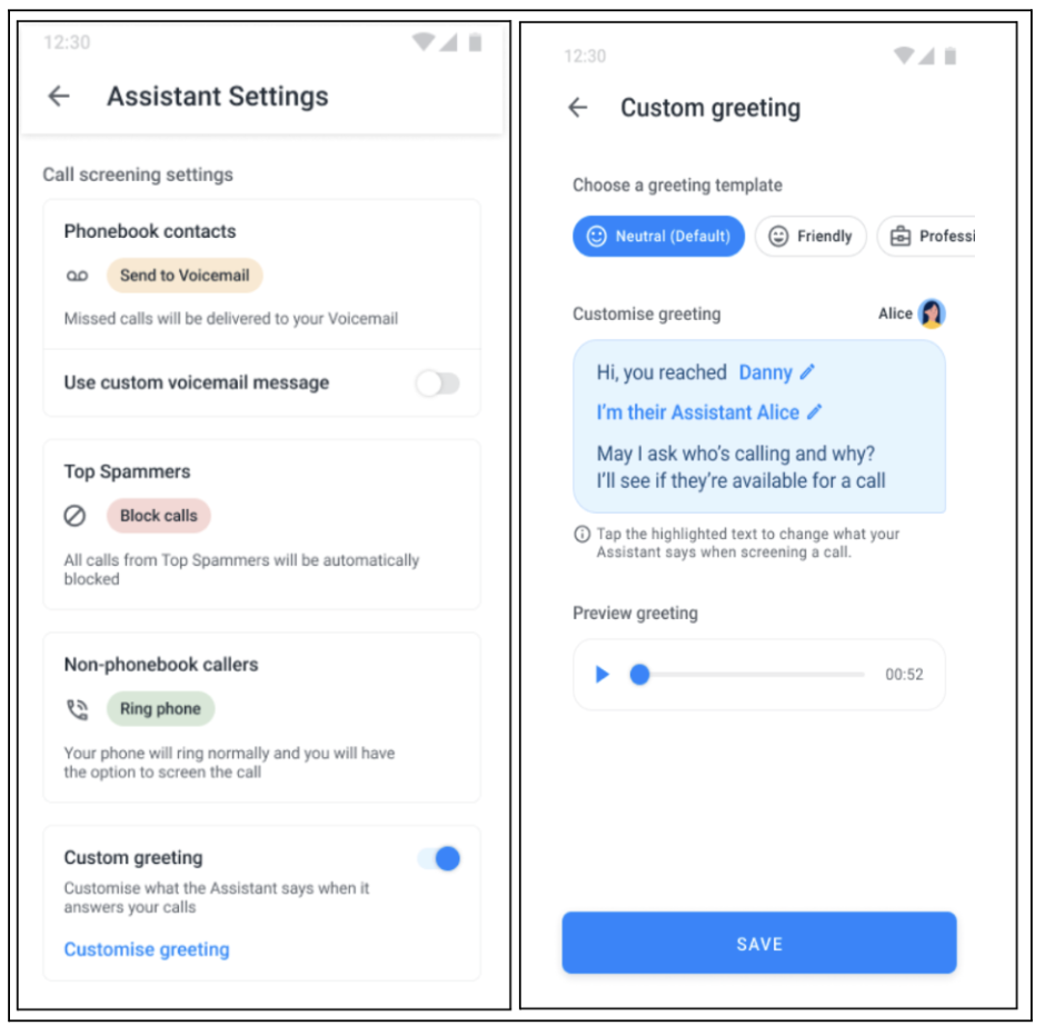 The custom greeting allows you to set a personalized introduction for the Assistant to use when answering incoming calls on your behalf.